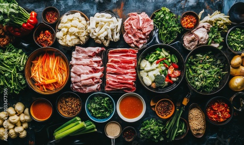 red, pepper, chili, garlic, onion, green, cilantro, parsley, ginger, carrot, bean, germinating, noodle, meat, beef, pork meat, sauce, broth, dipping, bowl, dish, asian, chinese, japanese, korean, hot, spicey, fresh, food, cooking