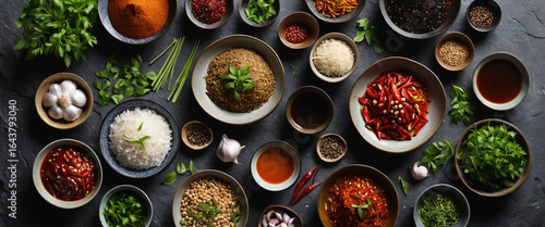kitchen, asian, spice, vegetable, herb, condiment, raw, topview, cooking, soy sauce, garlic, chili, ginger, harmony, no people