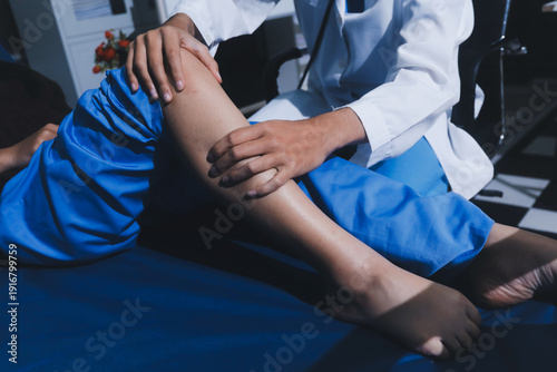 Asian male doctor examining foot of female patient sitting on bed in hospital room. Performing medical checkup. Diagnosing injury. Providing healthcare. Podiatry. Physical therapy. And rehabilitation