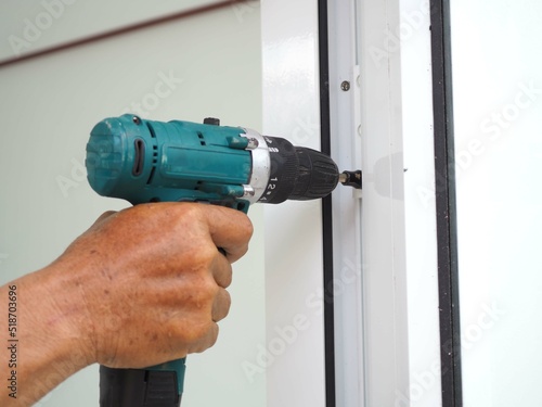 Asian man locksmith installing a lock on a new white door with a hand drill. closeup photo, blurred.