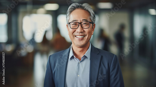 Asian mature professional business man standing in an office smiling confidently. Business corporate people background.