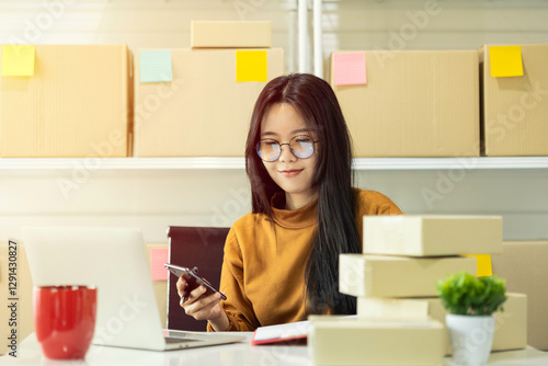 Asian owner holding a smartphone. Female entrepreneur preparing orders for shipping in a warehouse. Businesswoman running an e-commerce small business.