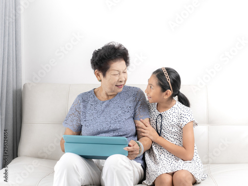 Asian senior woman and girl using tablet at home, lifestyle concept.