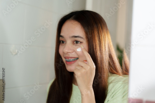 Asian teenage girl applying cream to cheek in bathroom. Long straight brown hair, light green ribbed top. Indoor setting with tiled walls. Expressing happiness and dedication to skincare routine.