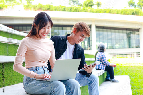 Asian university students use laptops to study projects. Sit on the concrete floor outdoors on campus. Education concept. copy space
