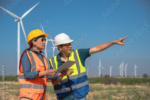 Asian wind turbine engineer man and woman working together in outdoor windmill power plant