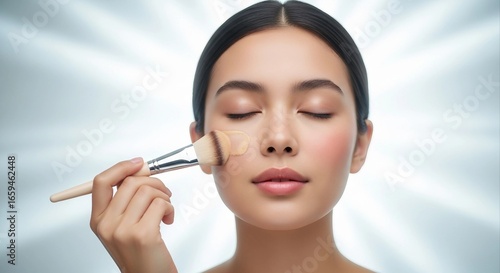 Asian Woman Applying Foundation with Brush on Flawless Skin | Beauty Treatment for Makeup Tutorial, Cosmetics Advertising, and Spa Wellness Promotion