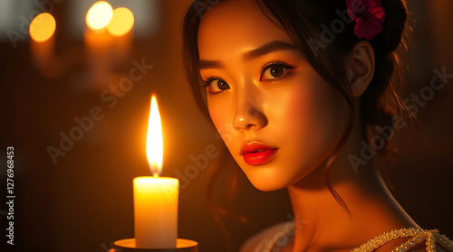 asian woman, red lipstick, dark hair, elegant, atmospheric, warm tones, cinematic, night scene, candle, light, flames, fire, candle, dark, burning, candlelight, christmas, wax, celebration, burn, night, holiday, romantic, black, love, decoration, warm, glowing, darkness, glow, romance