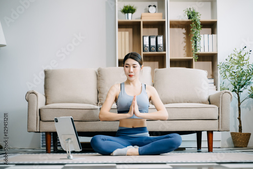 Asian Woman Doing Yoga and Watching Online Tutorials on Laptop, Training in Living Room at home