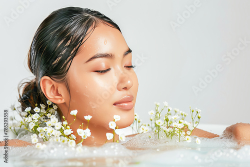asian woman enjoying floral bath spa