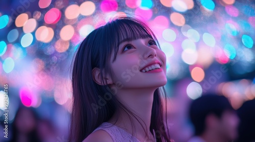Asian woman enjoys vibrant festival night, dressed in a stylish, sexy outfit. Colorful bokeh lights in background create dreamy atmosphere, enhancing joyful mood of event.