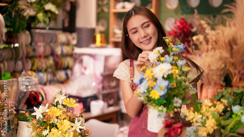 Asian woman florist arranging vibrant flowers creating beautiful floral bouquets in bustling flower shop showcasing creative work small business owner happy