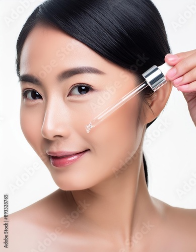 Asian Woman holding a Pipette with Skincare Serum - Applying Serum to her Face - Hyaluronic Acid, Anti Aging, Moisturiser, Repair, Hydrating, Vitamin, Ascorbic, Retinol, Exfoliant, Azelaic