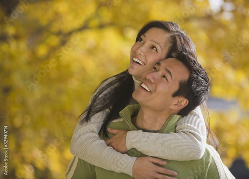 asian ethnicity, autumn, boyfriend, caring, carrying, color image, couple, day, fresh air, friends, girlfriend, happy, horizontal, hugging, leaf, avocation, love, man, outdoors, people, photo, recreation, romance, smiling, standing, surprise, together, two people, woman, wonder, young adult