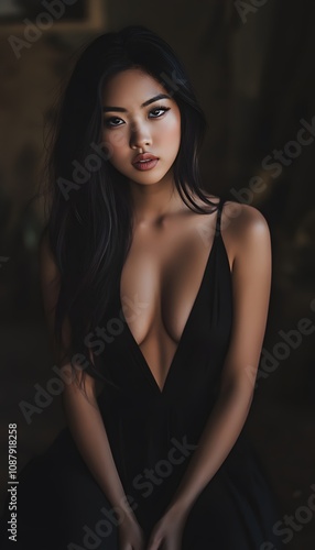 Asian woman in a black floor-length dress with a plunging neckline