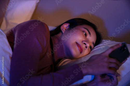 Asian woman lying in bed and using smartphone at night in the bed room , Insomnia affect healty. Dependence on social networks in adolescents..