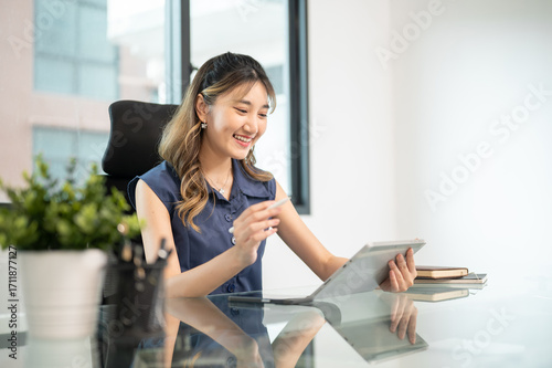 Asian woman office worker holding stylus as looking at tablet while sitting at glass table in office