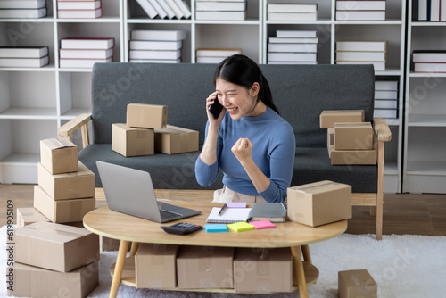 Asian woman online store business owner, online shop owner working from home, posting products for sale on website and accepting orders and packing products for customers with private courier service.