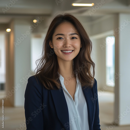 asian woman, real estate agent, wearing white shirt and navy jacket, smiling and stand in empty apartment room