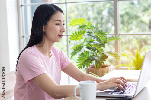 Asian woman sitting at home working with laptop on vacation and white coffee mug on the table.