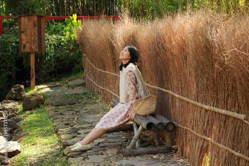 Asian woman sitting in the Japanese garden.
