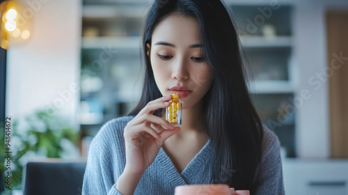 Asian woman taking her daily vitamins at home, focusing on maintaining her health,