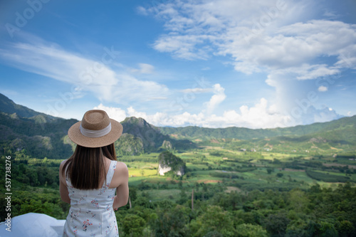 Asian woman traveler relaxing and watching a beautiful mountain view with nature in the morning, Phu Langka National Park, Thailand