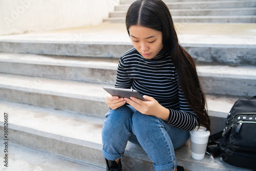 asian, asia, woman, tablet, people, digital, young, female, technology, outdoors, casual attire, computer, person, beautiful, cyberspace, outside, lifestyle, smile, connection, mobile, city, read, cheerful, communication, app, application, wireless, professional, urban, modern, device, pretty, touch screen, using, calm, joy, electronic, social network, display, 20s, screen, touch, connected, portrait, looking, holding, entertainment