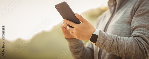 Asian woman using smartphone outdoors in the morning
