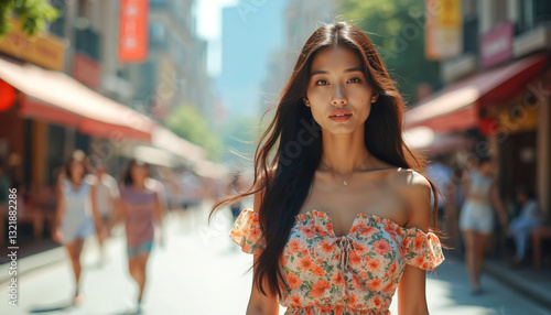 Asian woman walking on city street at summer day. Young female model dressed light dress looks at camera. Urban lifestyle concept, summer vacation and travel.