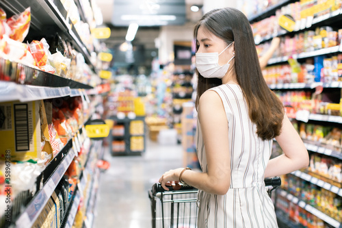 Asian woman wearing face mask push shopping cart in suppermarket . Girl choosing, looking somethings to buy at shelf during coronavirus crisis or covid19 .happy lifestyle or shopaholic concept.