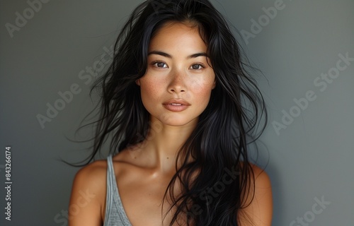 Asian woman with long black hair, wearing a grey tank top, posing for the camera against grey background