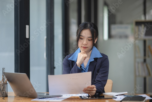 Asian woman working with document papers and laptop sitting at desk workplace office.