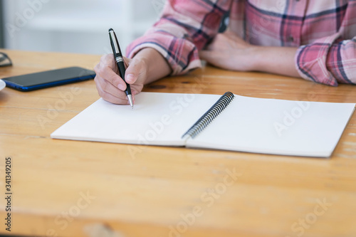 Asian woman writing something in her notebook. business women hand writing something on her paper note.