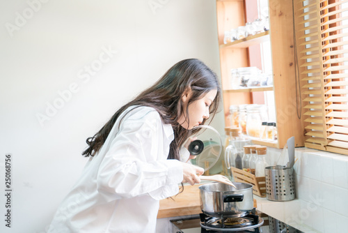 Asian women after wake up working in kitchen prepare breakfast meal