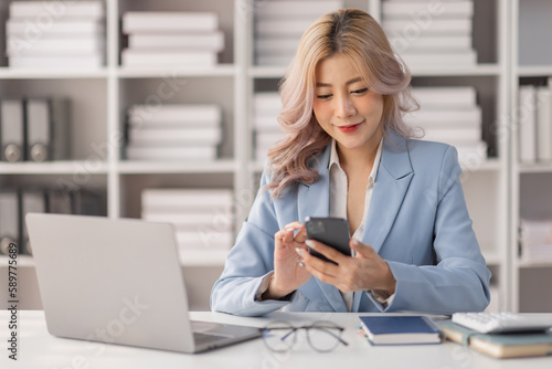 Asian women hold smartphone and use pc at the workplace. Project stats financial data sales charts on laptop and cellphone