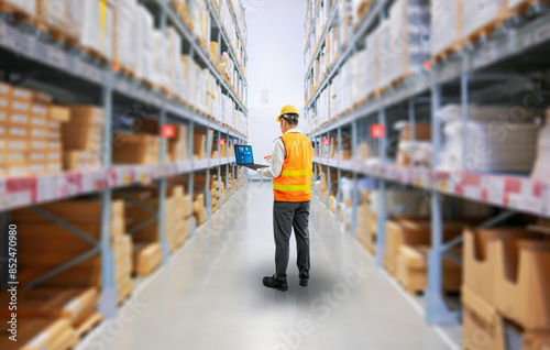 Asian worker or engineer in warehouse with cardboard boxes