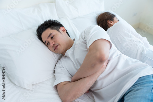 Asian young couple lying down on bed with painful after fight argument.