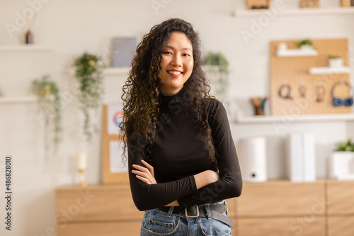 Asian young creative or designer with curly hairstyle cross arm and smiling at home.Happiness female freelancer smart smile and confident enjoying with job or work.Good moment and positive emotional