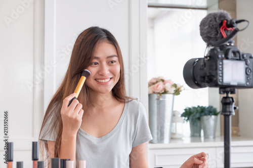 Asian young female blogger recording vlog video with makeup cosmetic at home online influencer on social media concept.live streaming viral.