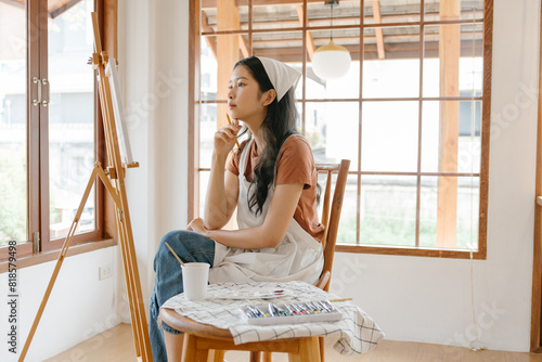 Asian young talented woman artist coloring on painting board in house. Attractive beautiful female draw art picture, creating artwork with watercolor paint and brush enjoy creativity activity at home