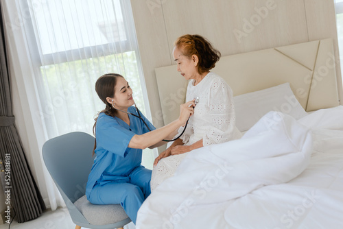 Asian young woman nurse at nursing home take care, patient and woman nurse walk in the park, man caregiver helping patient, Happiness Asian family concepts