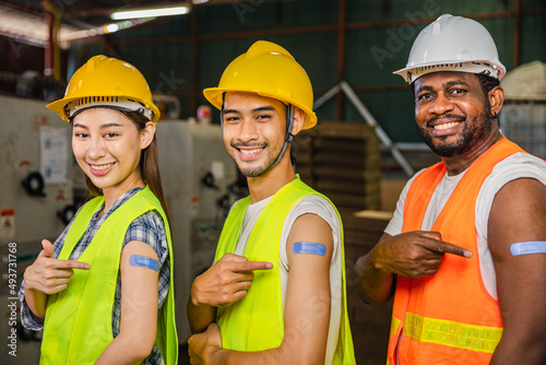 Asian young workers and African man pointing at his arm with a bandage after receiving the covid-19 vaccine.Vaccination for Essential Workers in healthcare at industrial factory.
