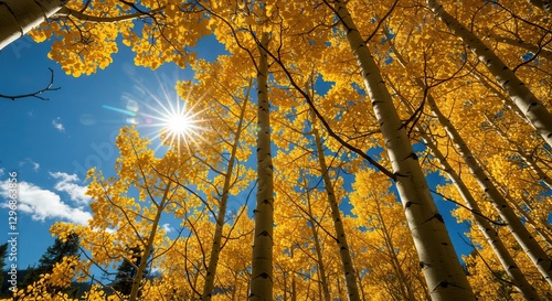 tree, standing, looking up, low angle, sunny, bright, illuminating, vibrant, colourful, clear, daytime, autumn, fall, season, aspen, forest, timberland, leaf, foliage, gold, yellow, sky, blue, sun, sunshine, sunbeam, light, flare, energy, growth, nature, scenic, landscape, environment, park, tour tourism, travel, wallpaper