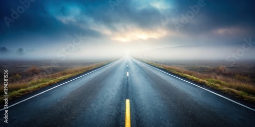 Asphalt highway disappearing into a misty sunrise, promising adventure and the unknown
