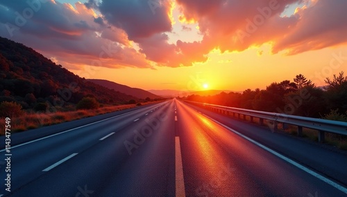 Asphalt highway with road markings at sunrise, distance, highway, path