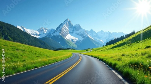 Asphalt ribbon unwinding through vibrant meadows, towards majestic snow-capped peaks under a radiant sun.