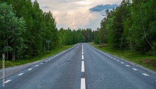 Asphalt road in nice coniferous forest.