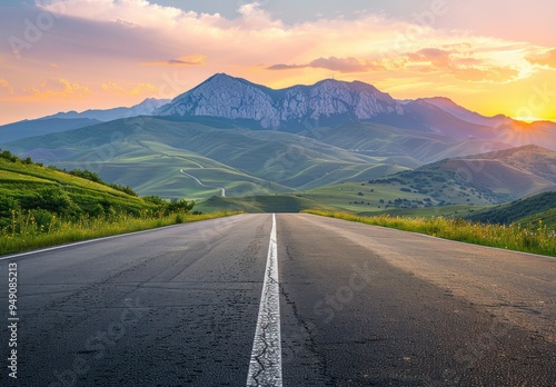 road, mountain, asphalt, sunset, landscape, sky, horizon, nature, view, travel, adventure, drive, highway, journey, path, route, green, grass, field, hill, peak, ridge, tree, forest, cloudy, summer, evening, gold, light, sun, ray, cloud, blue, white, colours, panorama, scenery, beautiful, amazing, photo, photo