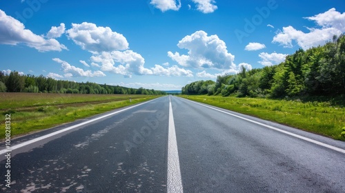 road, asphalt, highway, countryside, lane, pavement, route, path, driveway, street, travel, journey, driving, nature, sky, blue, cloud, sun, sunshine, grass, field, green, tree, forest, horizon, landscape, summer, day, outdoors, rural, open, straight, white, line, distance, freedom, perspective, direction, serenity